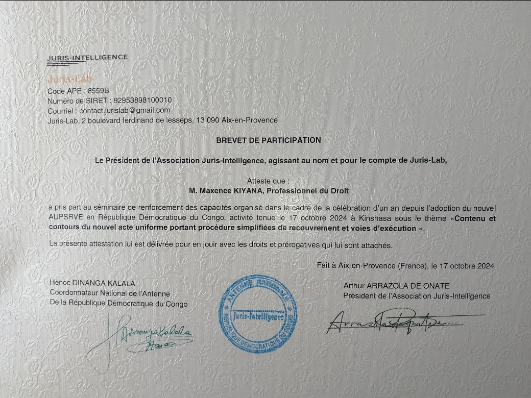 Les points forts de Maxence Kiyana, l’avocat au barreau de Kinshasa/Matete en RD Congo, spécialisé en Droit économique et social