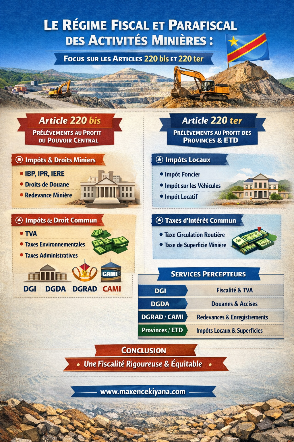 Cette taxe n’est pas un impôt sur le profit, mais une contribution destinée à couvrir les coûts des prestations et de la gestion des droits constatés par les titres miniers. Elle est perçue au profit du Cadastre Minier (CAMI), qui en rétribue une partie aux services du Ministère des Mines chargés de l’administration du Code.