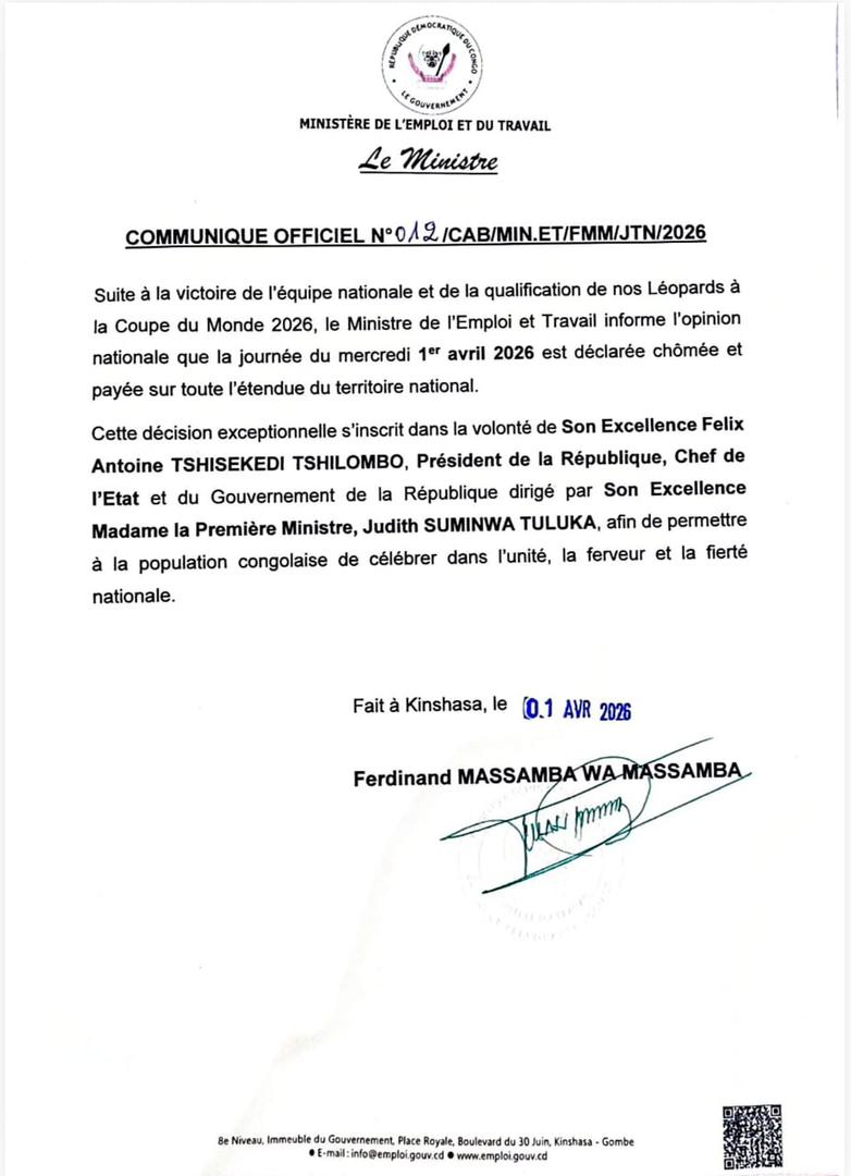 C’est officiel. Suite à l’exploit historique de l’équipe nationale de la République Démocratique du Congo, le gouvernement a décidé de marquer le coup. Le Ministère de l’Emploi et du Travail a annoncé, via un communiqué officiel, que la journée du mercredi 1er avril 2026 est déclarée chômée et payée sur toute l’étendue du territoire national.